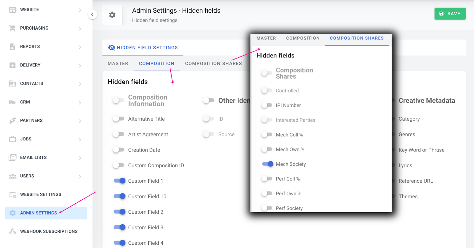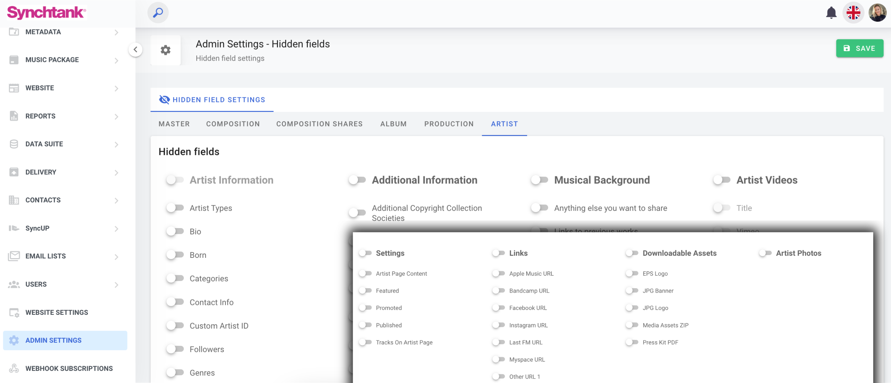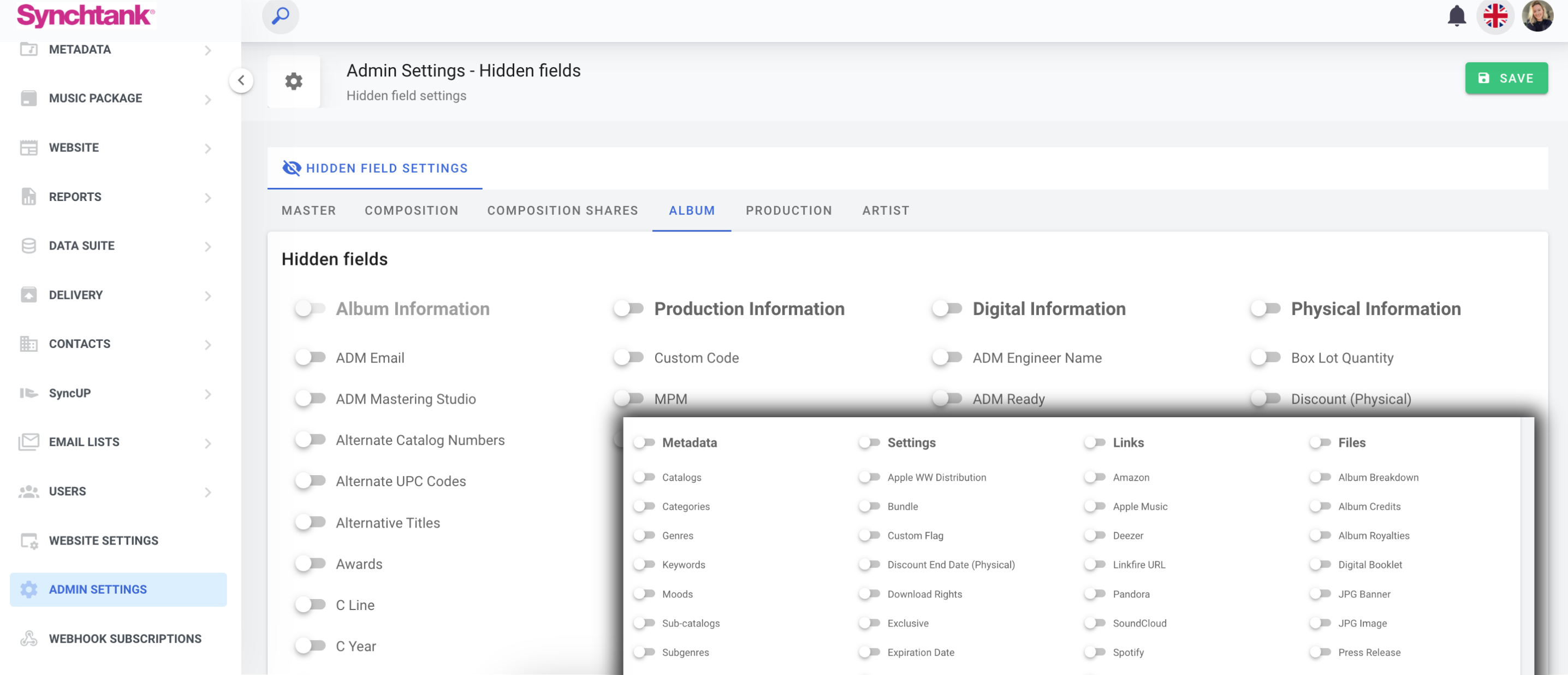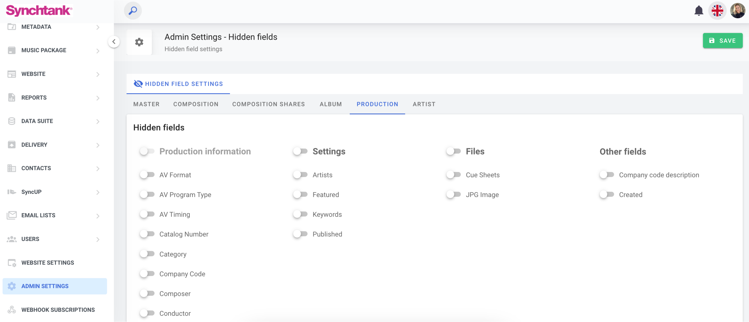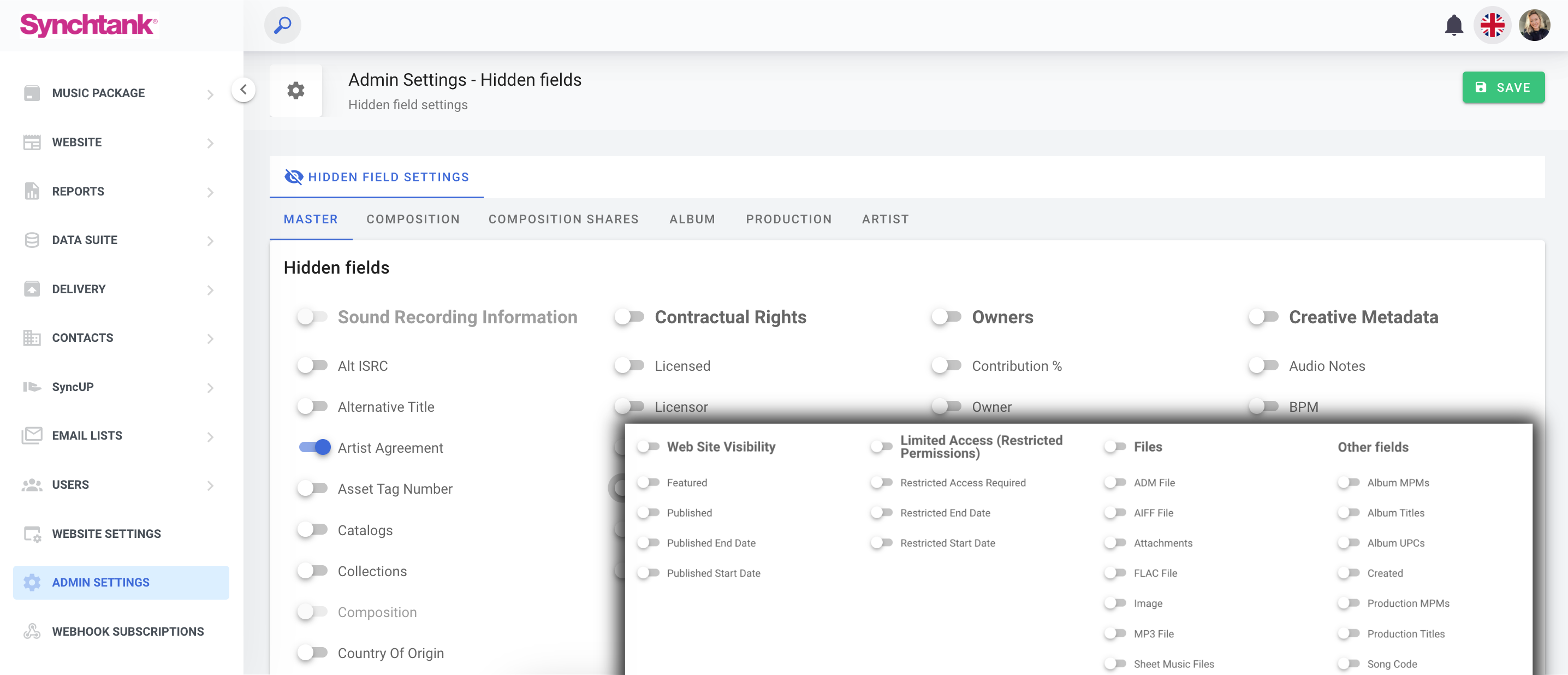 Here you have the flexibility to add new fields to Masters, Compositions, Composition Shares, Album, Productions and Artist form that is unique to your enterprise.