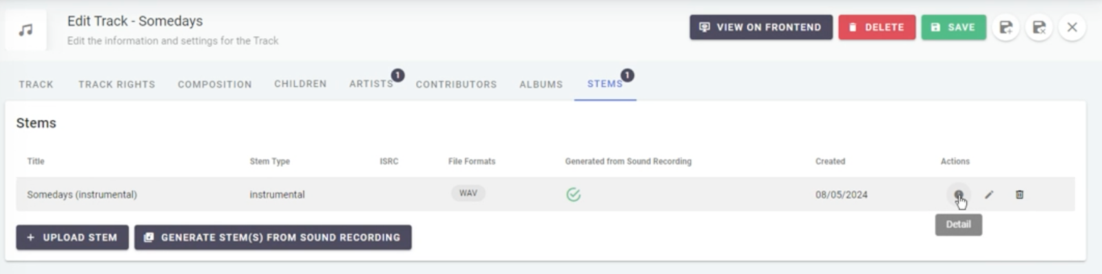 To edit your stem, select the pencil icon which is next to the information icon, and an editing pop-up will appear, here you can amend the name, stem type and ISRC - again you can download here.