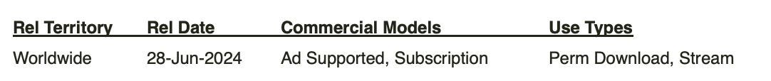 Data Included in the Release Deals: Release Territory, Start & End Dates, Commercial Models, Usage Types & Pricing