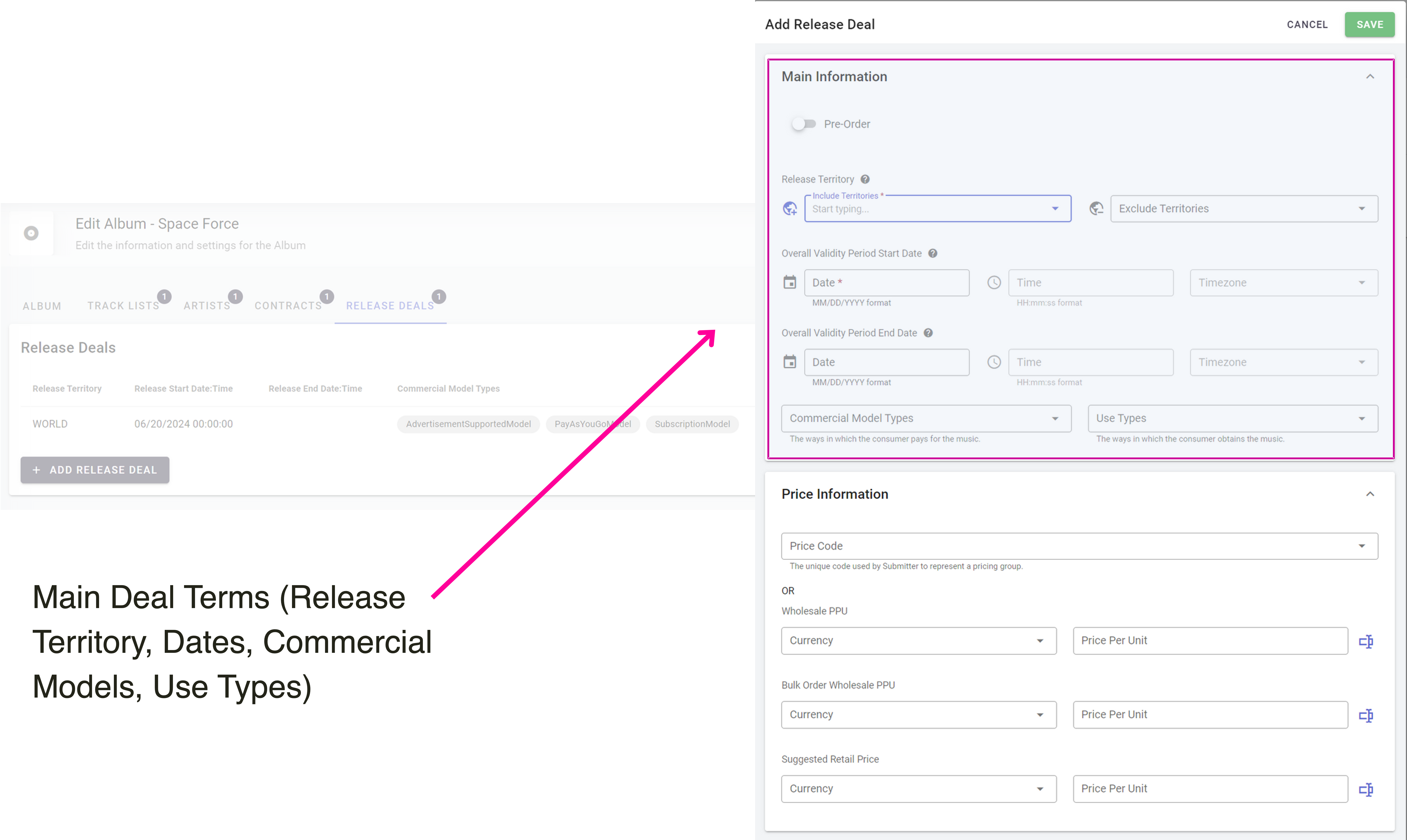 Within the main information section you can add the details of your release deal. There is a slider which allows you to show if the deal being added is a pre-order deal (if your Album is a pre-order deal then you fill out all the details and create a new release for the pre-order deal as those terms can differ).