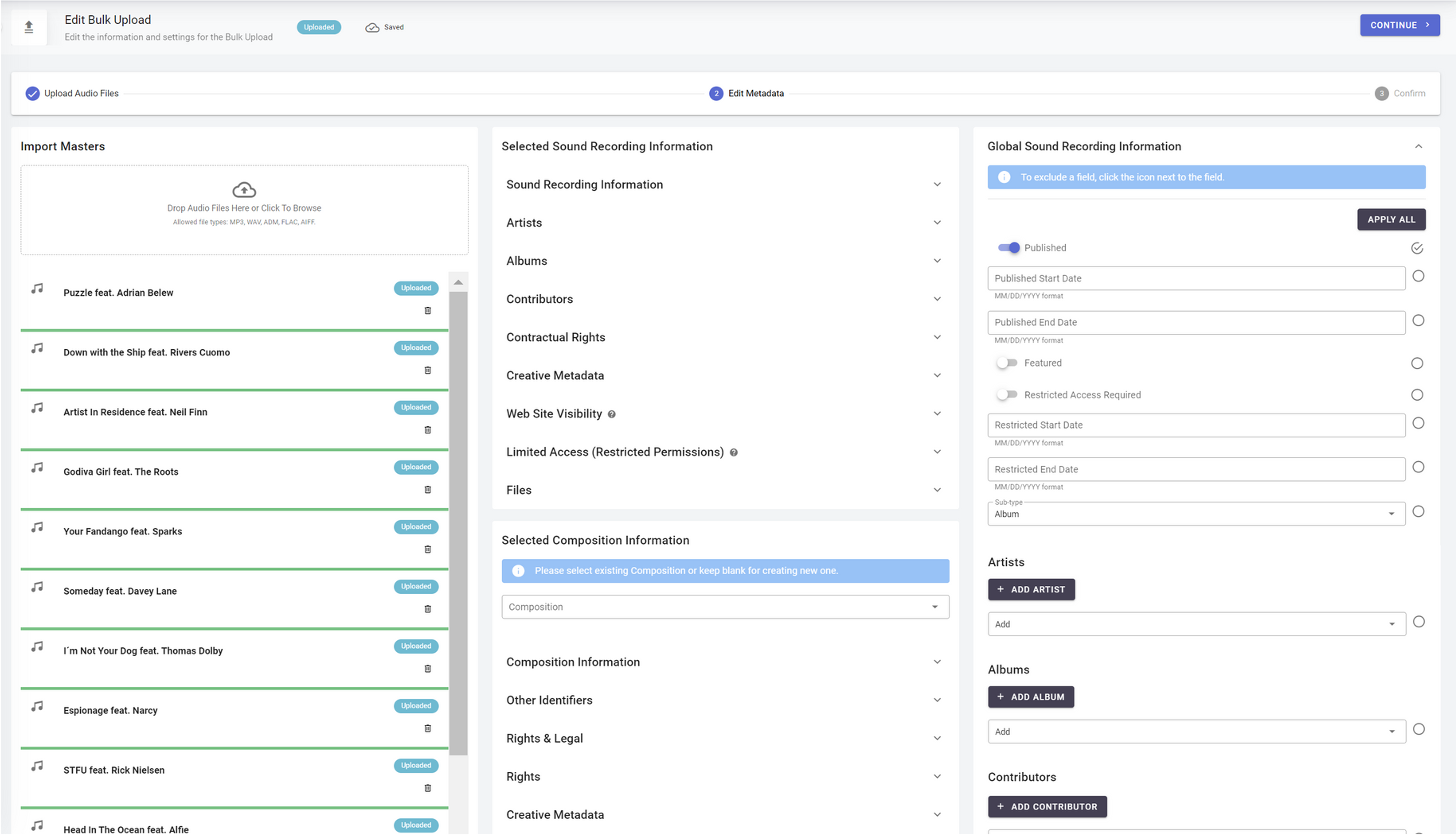 Import Tools: Bulk Upload (importing catalog via Audio Files) has been streamlined and upgraded to reflect the new schema and interface designs (including Compositions 2.0). It has all the new fields, sections and everything new mentioned above.