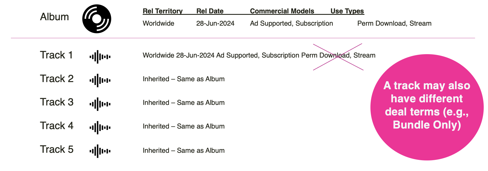 An Album/Release can have one or many tracks, e.g. an EP with four tracks or a single release with different versions or an Album with 10 tracks. So the album will have its own terms and each track could have its own set of terms as well.