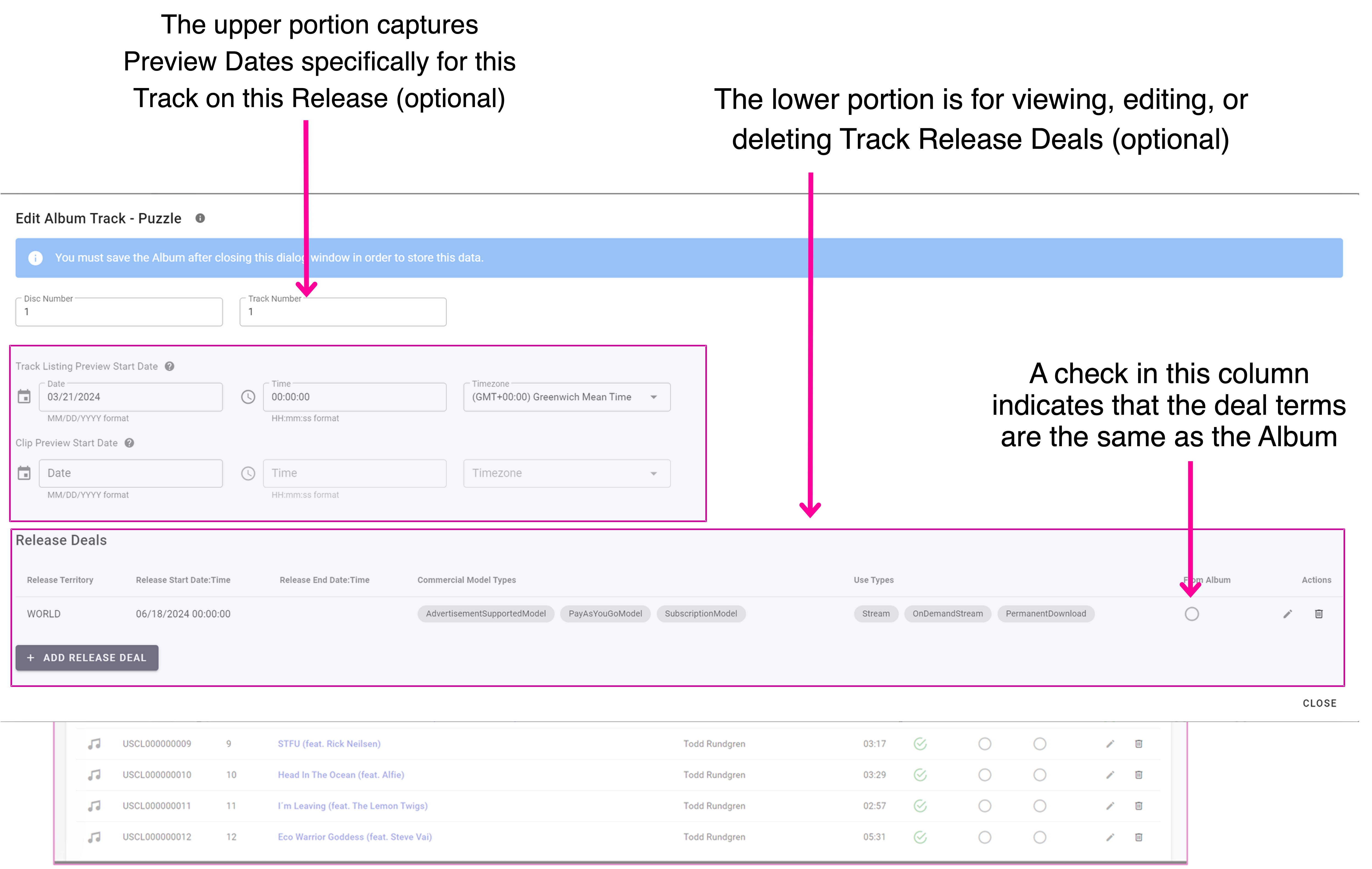 The Track Lists tab (formerly ‘Sections’) shows all Tracks on the Release. The columns for Download, Streaming, and Bundle Only have been removed (now found in Track Release Deals) but we have two new columns ‘Preview Date Overrides’ so you can see if the dates on the track do or do not match the album and ‘Release Deal Overrides’ which is when the track deal terms do not match the release deal terms. All allowing you to see at a glance if tracks differ.