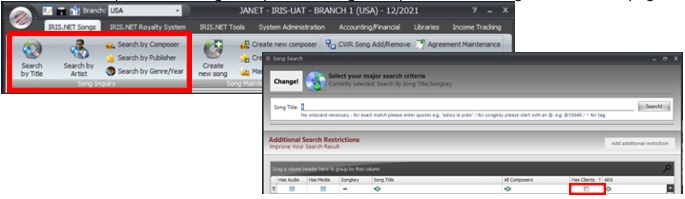 - Search for the songs you would like to update. I.e., by composer, publisher, etc. You can also filter your search with the "Has Clients" field and choose client "null" or unchecked.