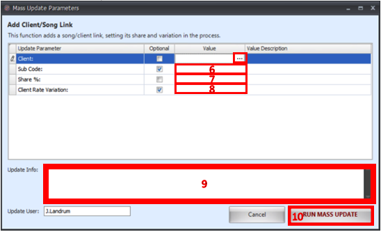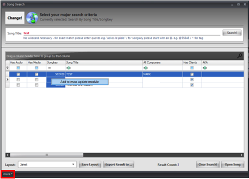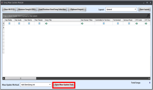 - Once inside the module, make sure the songs are the songs you want to update (you can select and delete (click Remove Song(s) (DEL)) if you got a rogue song in there. At the bottom (client/song link is the default) click Open Mass Update Tool.