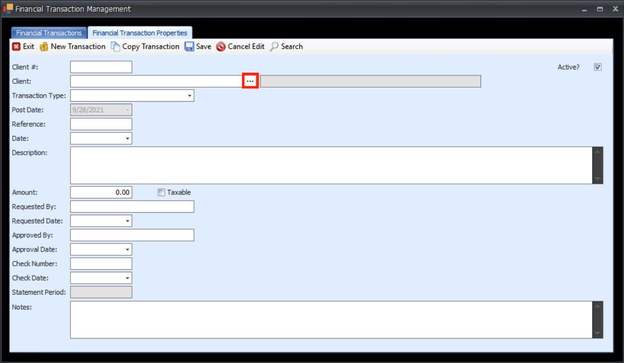 - You must enter a client, to do this click the … at the end of the client field to open a search window.