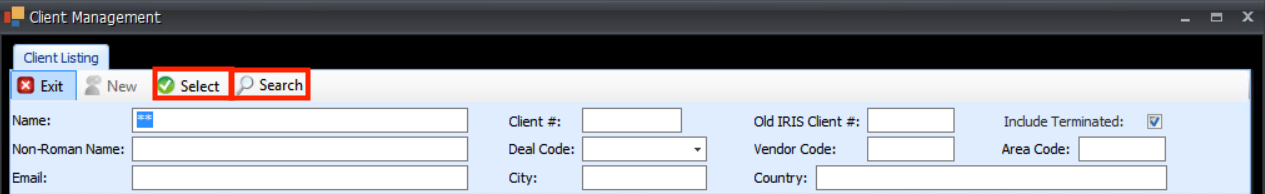 - Search for the correct client using the search fields (or leave them blank to return all clients) then click Search. Select the correct client and click Select (This will automatically populate the Client # field).