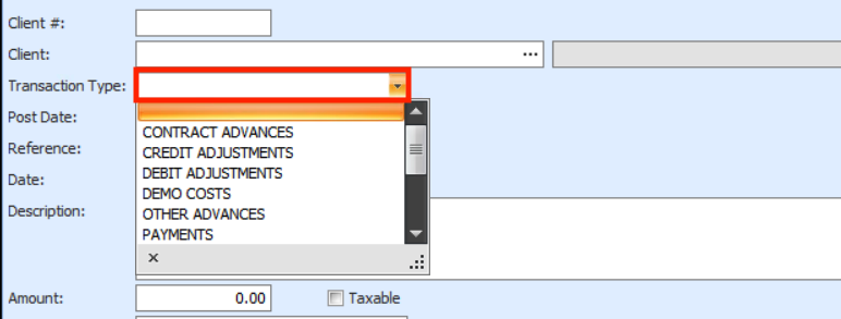 - Select the transaction type by clicking on the Transaction Type field to open a dropdown. Select the correct transaction type.