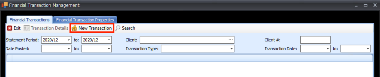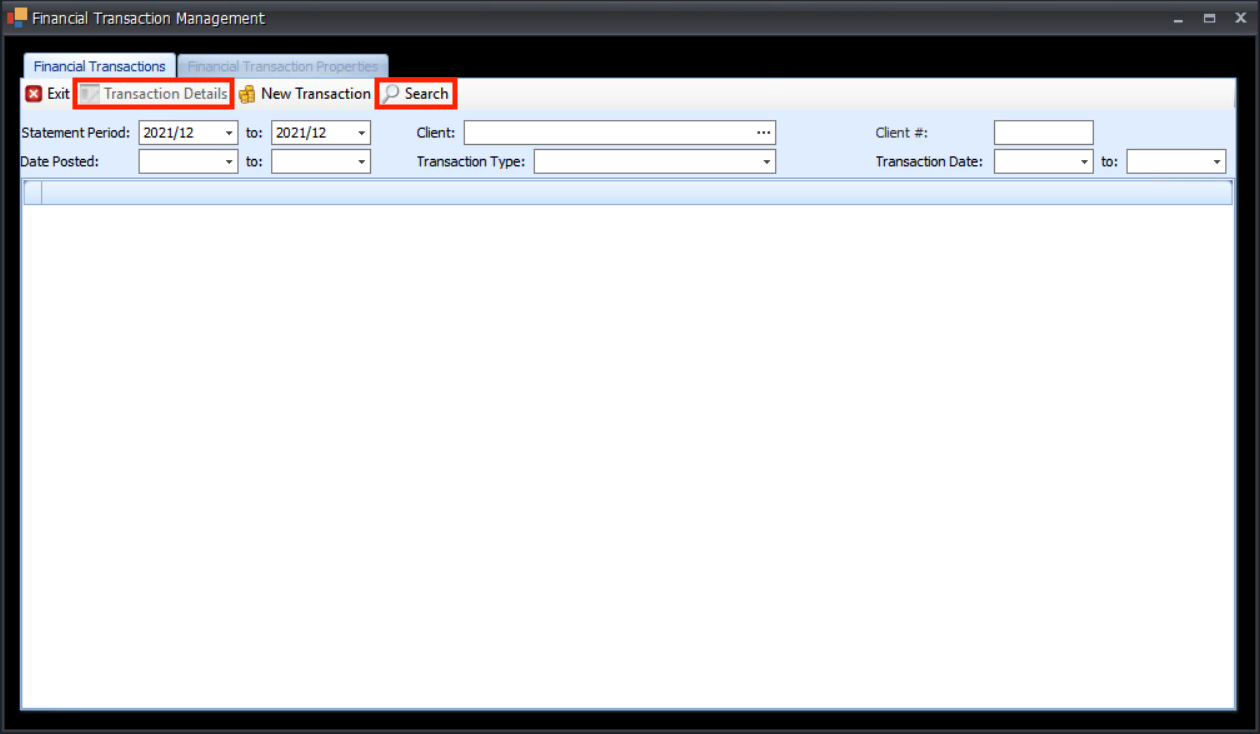 - In the new window that opens you can search for existing financial transactions by entering search terms into the relevant fields (if you want the search to return all financial transactions leave all the fields blank) and then click Search.