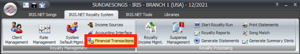 - In the second tab of the IRIS bar (IRIS.NET Royalty System) click on Financial Transactions.