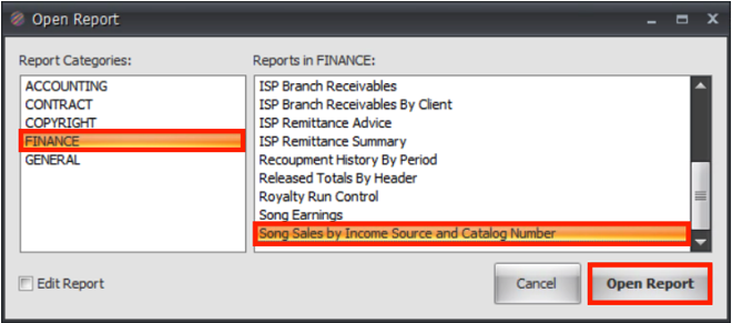- In Report Categories choose Finance then scroll down and click on Song Sales by Income and Catalog Number.