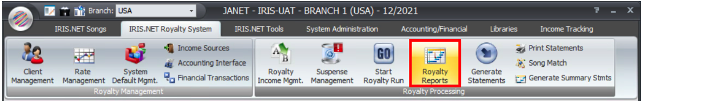 - Select the IRIS.NET Royalty System tab, then select Royalty Reports.