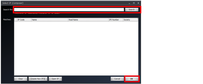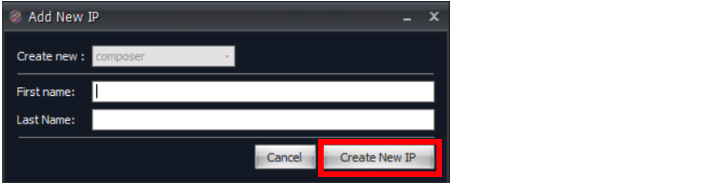 - Enter the Composer First Name and Last Name into the relevant Fields (Only the Composers Last name is required to continue) and then press Create New IP.