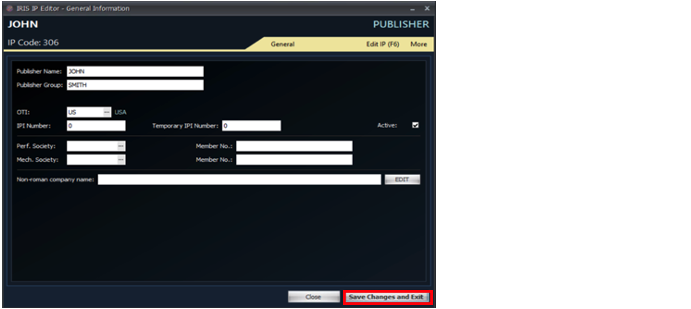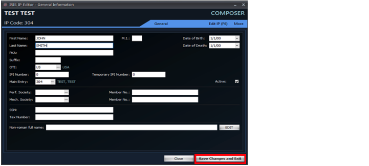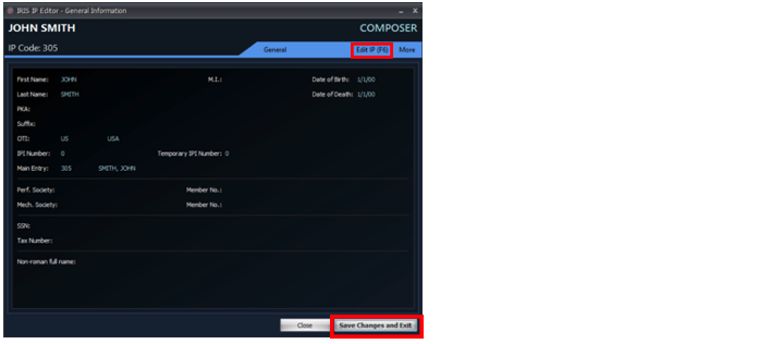 - IP window will open, click edit IP to edit IPI number, affiliations, DOB, etc. Then click Save Changes and Exit when Finished.