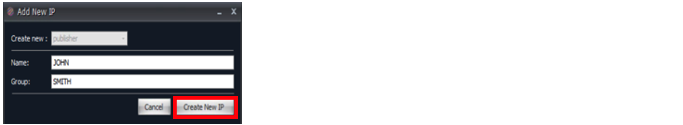 - Enter the Publisher Name and Group into the relevant Fields (only the Publishers Name is required to continue) and then press Create New IP.