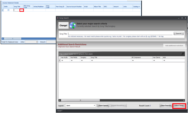- Then enter the song title into the Song Title column. You can click the … to open the Song Search window to add a song as well, search for and select the song then click Select Song. The Song must exist in the system before being added to the Detail Line.