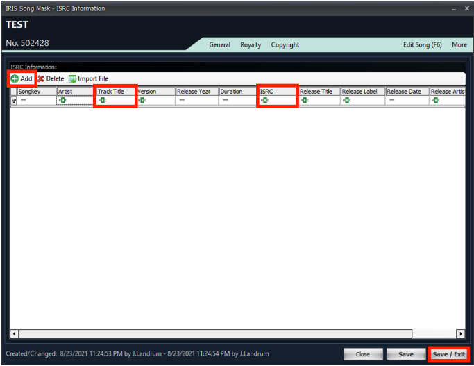 - The ISRC Information page will open. Select Add. A new line with the songkey will appear. You can add multiple ISRC entries.