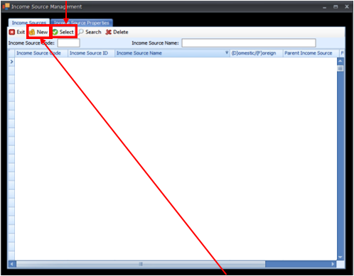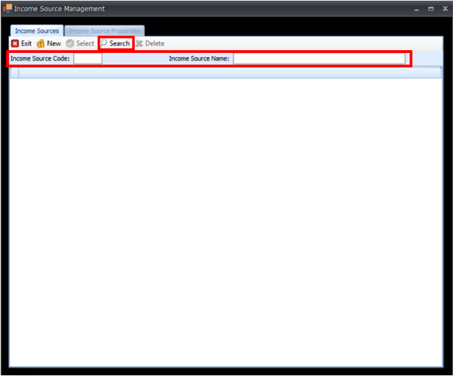 - A new window will open. Here you can search for existing Income Sources by Name or by Code. To do this enter your search term into the Income Source Code field or the Income Source Name field and then click Search. To display all Income Sources click Search without entering anything into the search fields. When searching an income type, prefacing with an asterisk will bring back a keyword search (i.e.*Sony will return all sources with Sony within them). Not using the asterisk will return all sources that start with Sony.