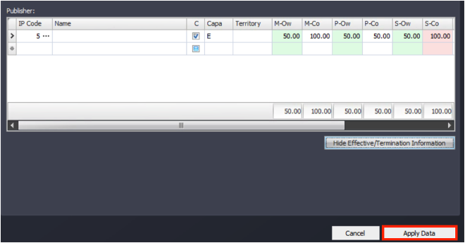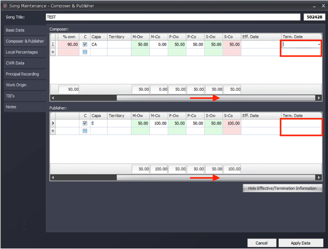 - Use the scroll bar located at the bottom of the individual Composer and Publisher box. You will now see the Effective Date (Eff. Date) and Termination Date (Term Date) box for each individual IP.