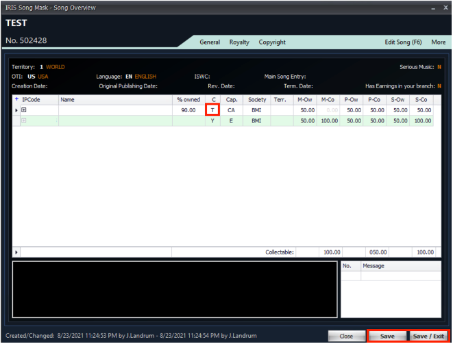 - When you are back at the Song Mask you will now see a "T" in the capacity box to indicate that IP is terminated. In order to see the dates you will have to go into EDIT and use the scroll bar. In addition the notes can also be populated to let the reader know more about the termination that is being marked.