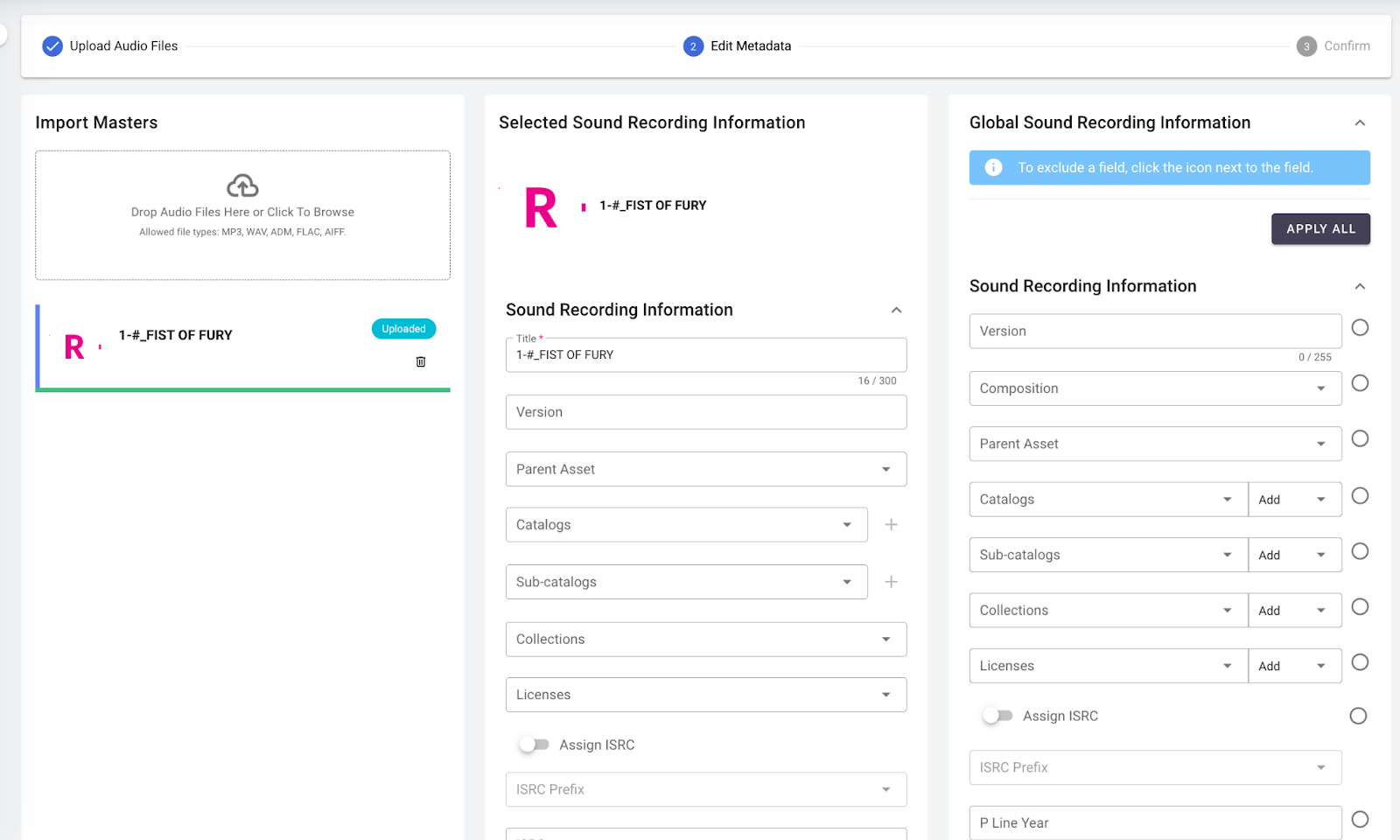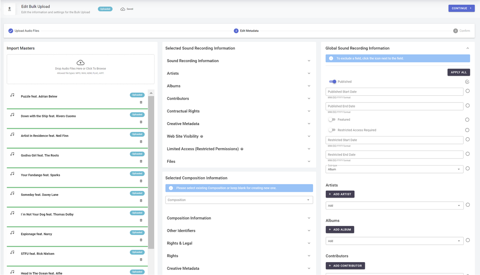 Bulk Upload (importing catalog via Audio Files) allows you to create records in the system for masters and compositions using the data embedded in the audio files and add or edit the data during the upload process.