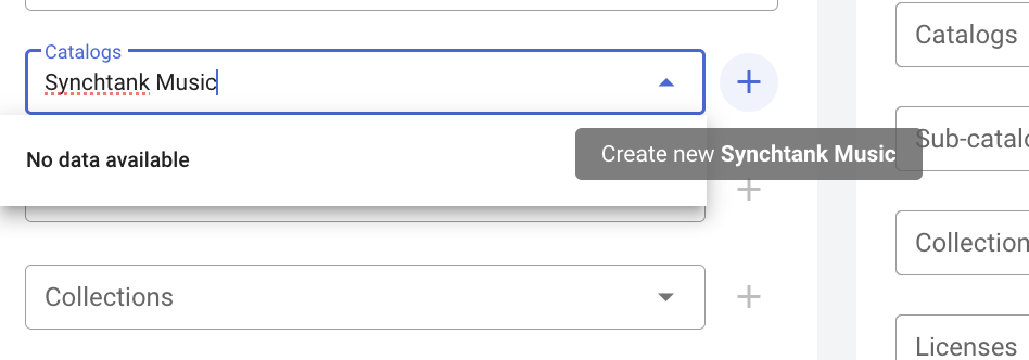 • In the selected Sound Recording column, you can select metadata from the metadata dropdowns but you can also create new metadata tags using the + button. For example, to add a new catalog you type in the name of the required catalog and press + and this will add it to the system.
