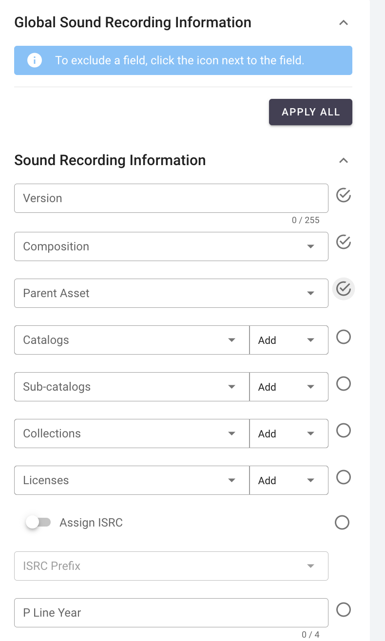 • In the Global Sound Recording Information column you can use the Apply All button to add the metadata to all the sound recordings in the upload. You can choose to add the metadata only to empty fields which will apply this change only when there is no pre-existing metadata or select Apply to All to overwrite any data that may already be stored for individual sound recordings.