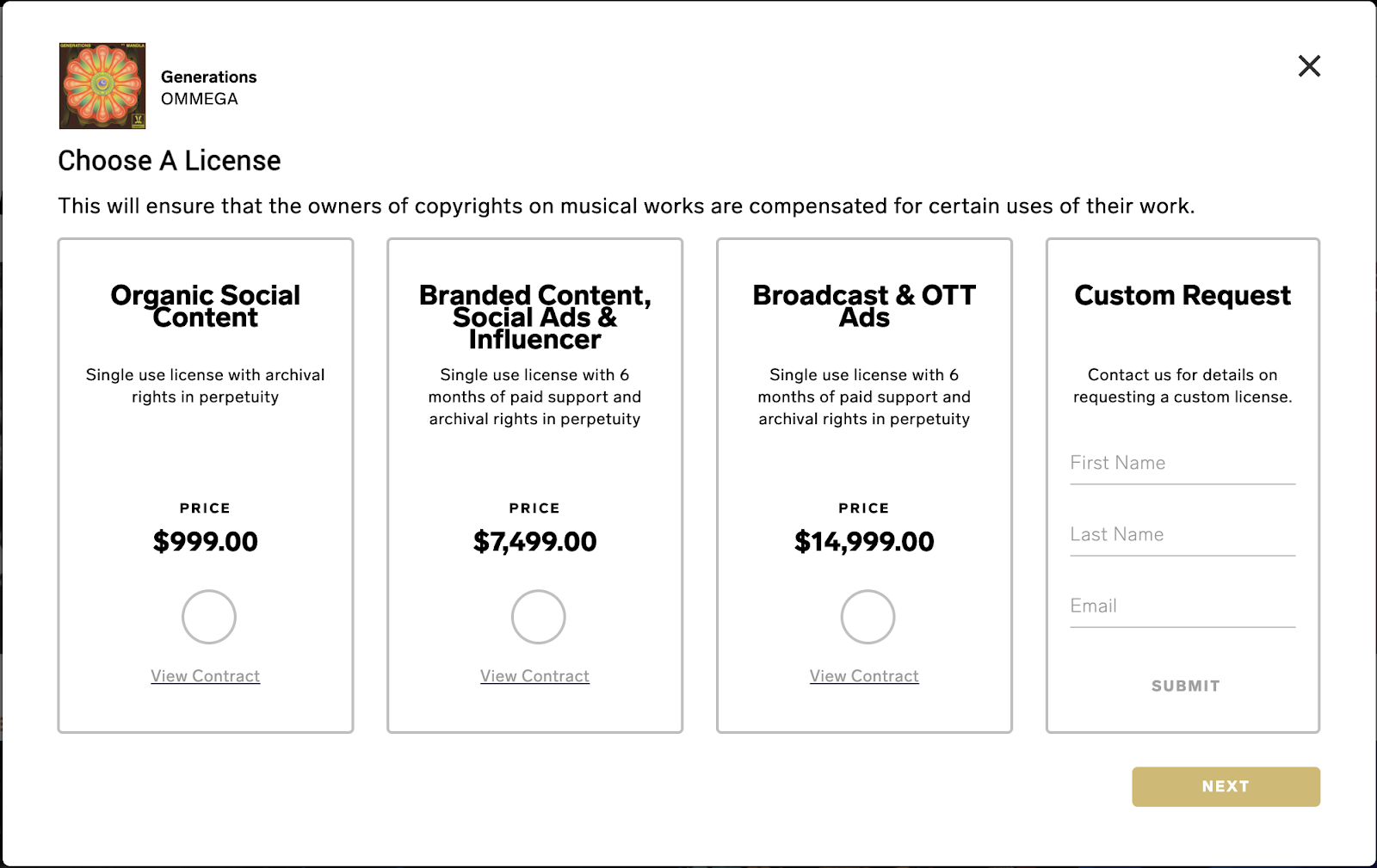 Here you can request to license a track via a form submission. Simply select the 3 dots on the track you would like to license and select “License”.