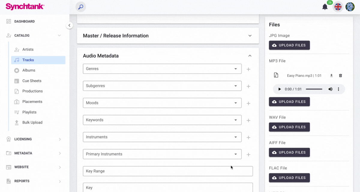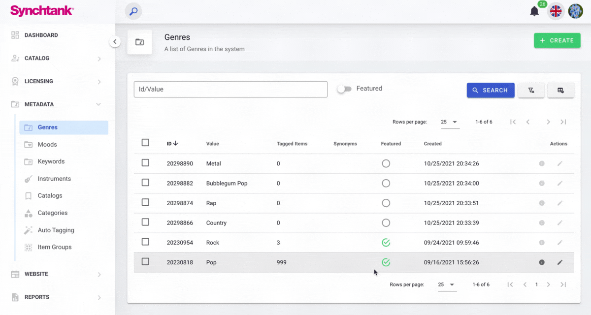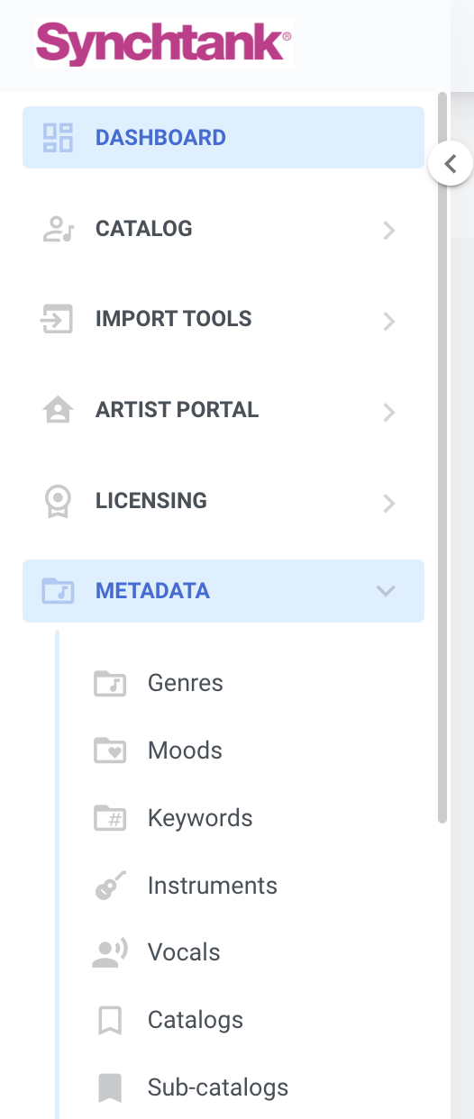 Firstly, the definition of music Metadata is as follows: the digital tags that identify a song’s title, artist, album, and more. Within the Synchtank system, you can manage and create Metadata content for your music catalog. This can be found within Synchtank Admin under the Metadata section and you are able to update the tags used for Genres, Moods, Keywords and Instruments.