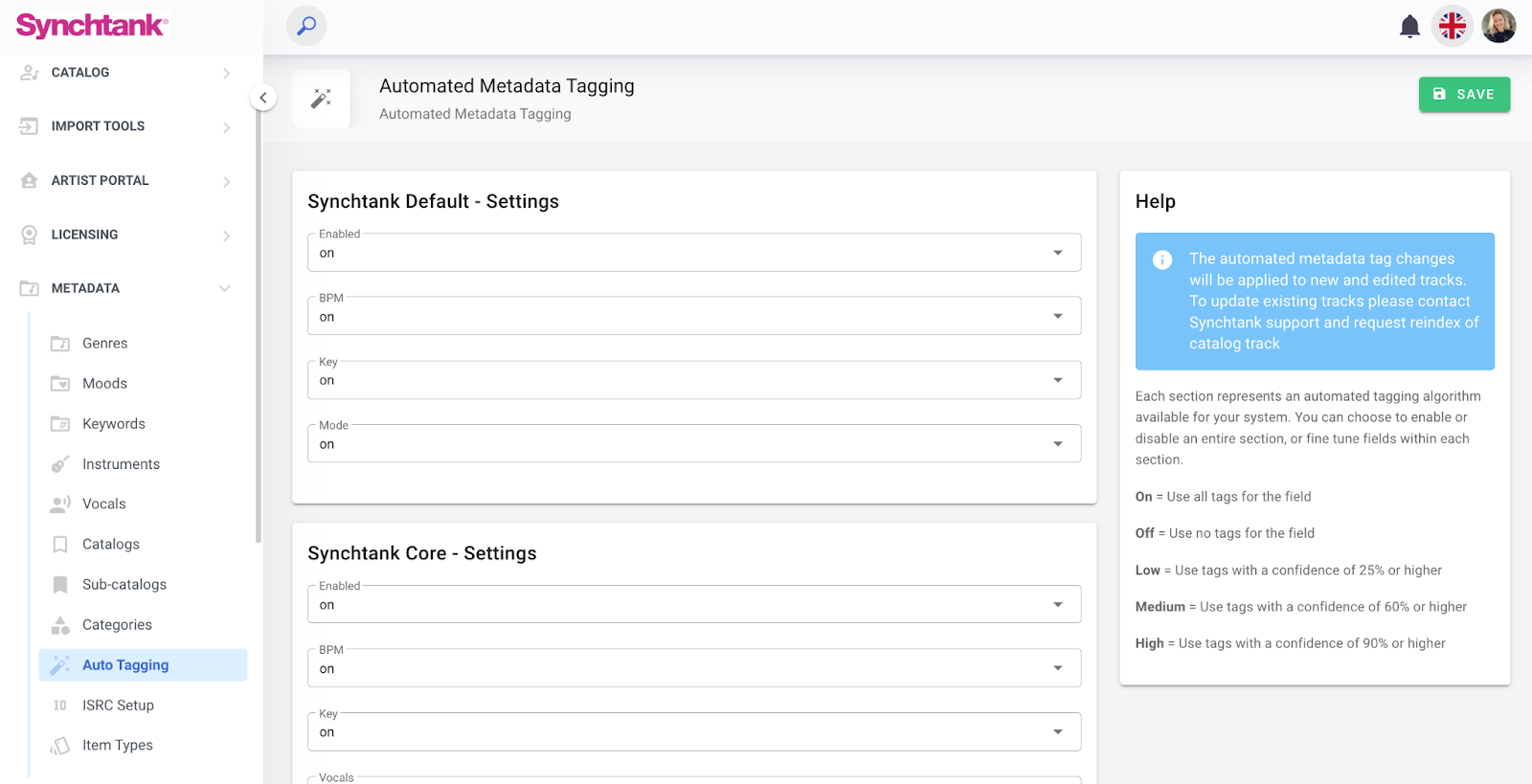 System wide automated Metadata tagging settings can be found in the Synchtank Admin under Metadata, and then Automated Tagging.
