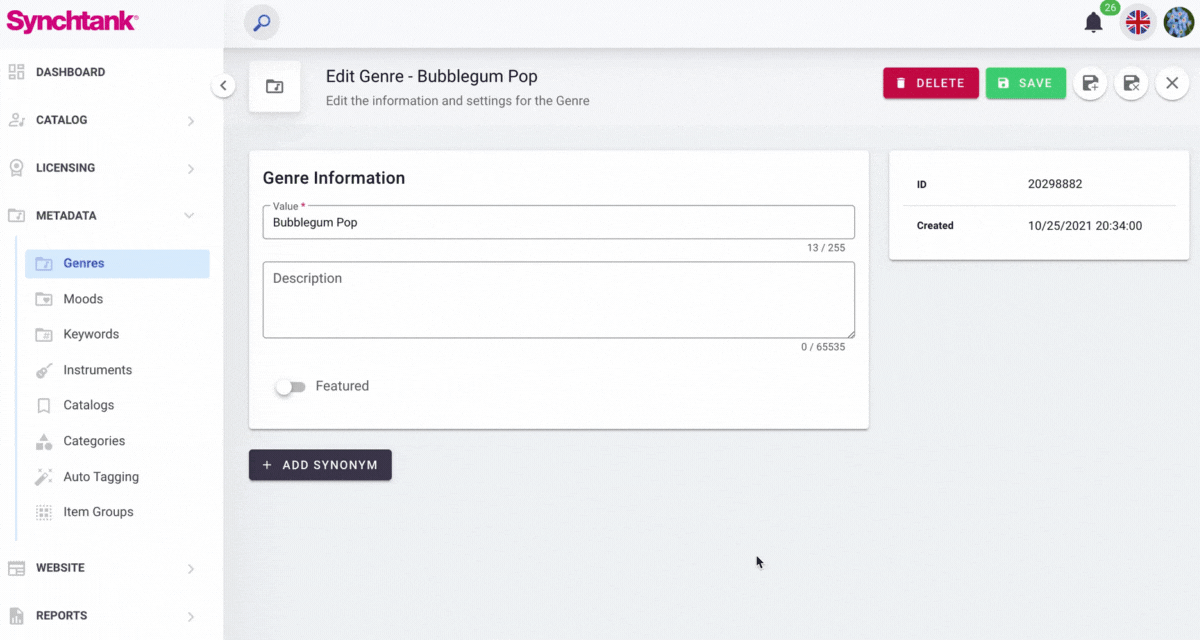 To add a new Genre in Synchtank Admin: