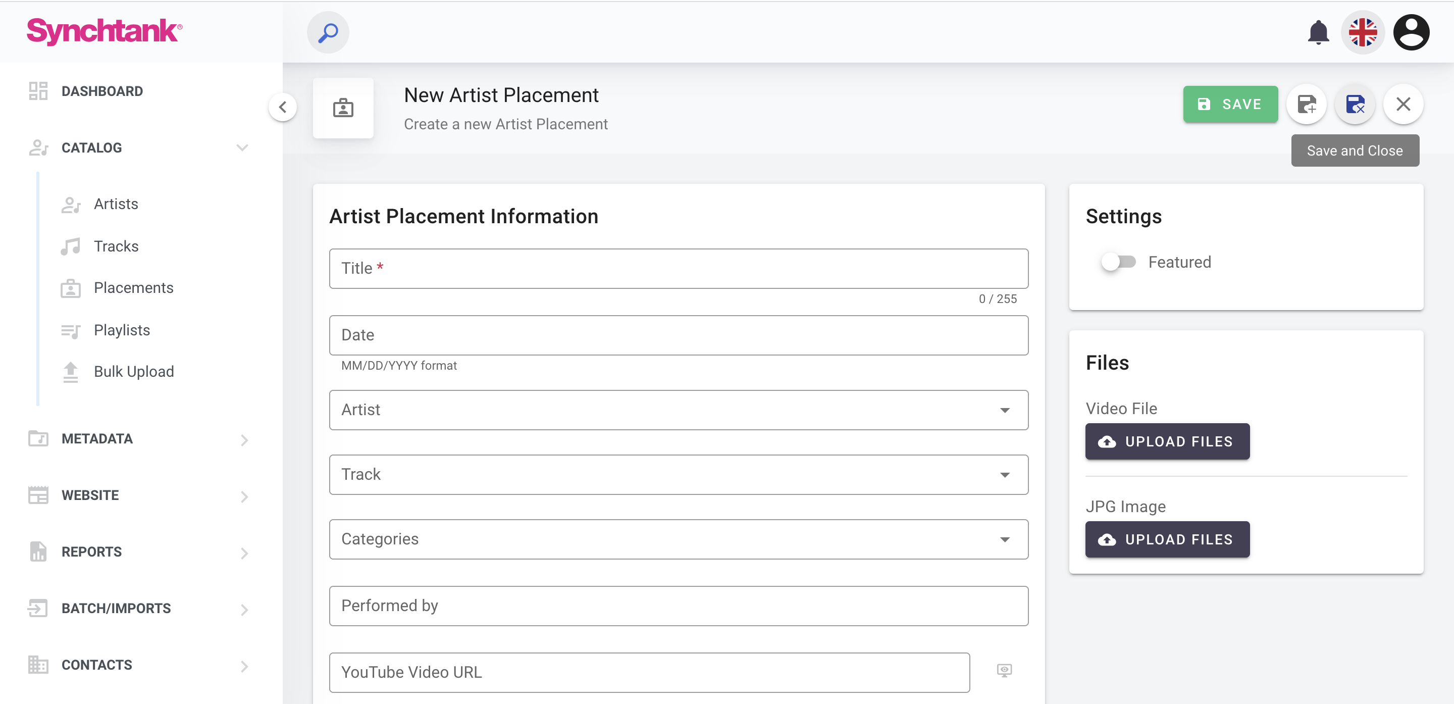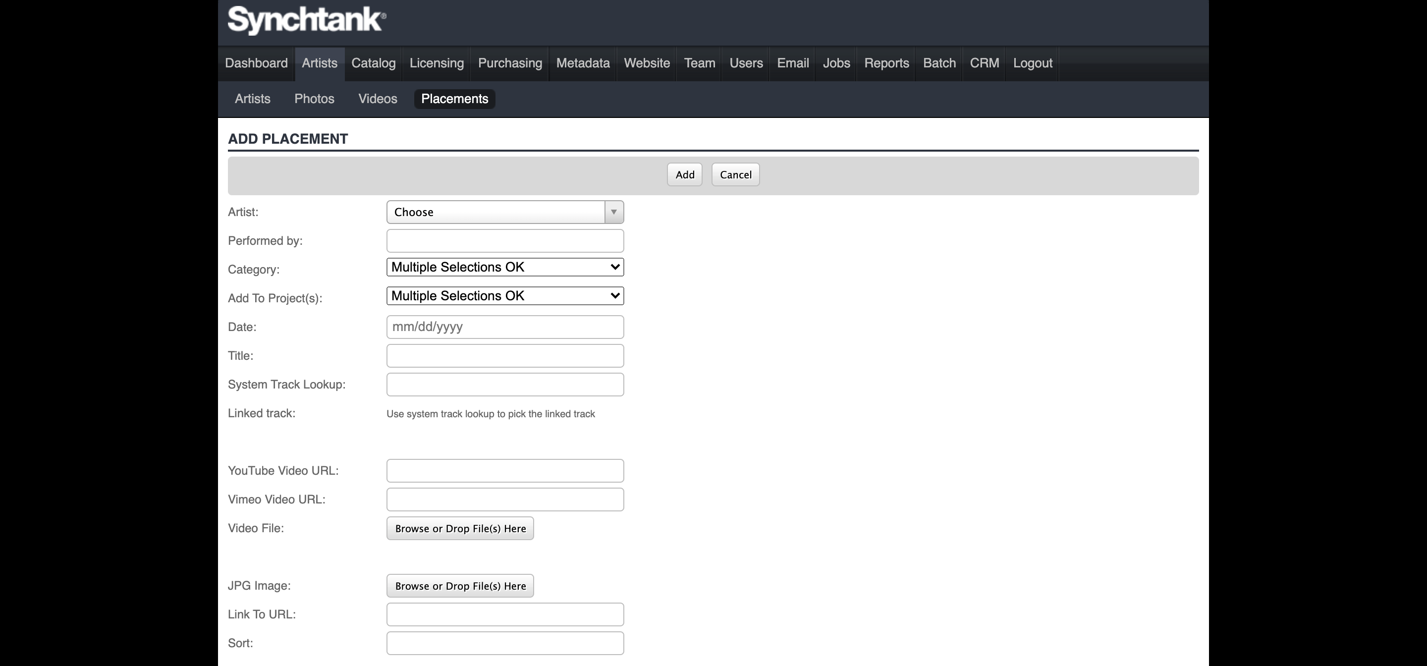 Creating a Placement is easy. To start creating a placement, you must go to the Placements Page in your CMS or in Synchtank Admin. In the CMS, Placements can be found under the Artists Tab, whilst in Synchtank Admin, they can be found under the Catalog Menu.