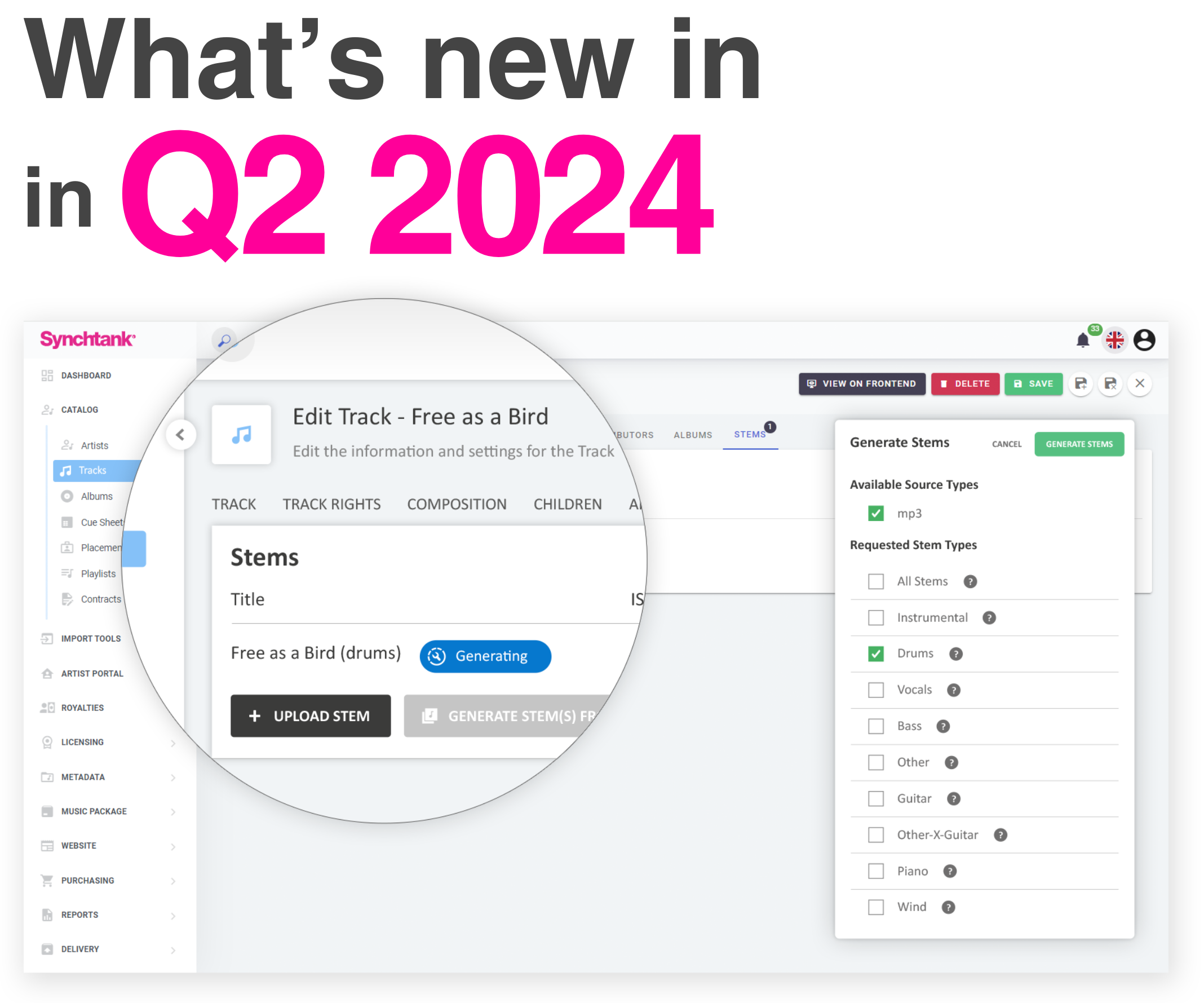 - Manage stems with structured support for tracks and masters including stem specific metadata and download permissions.