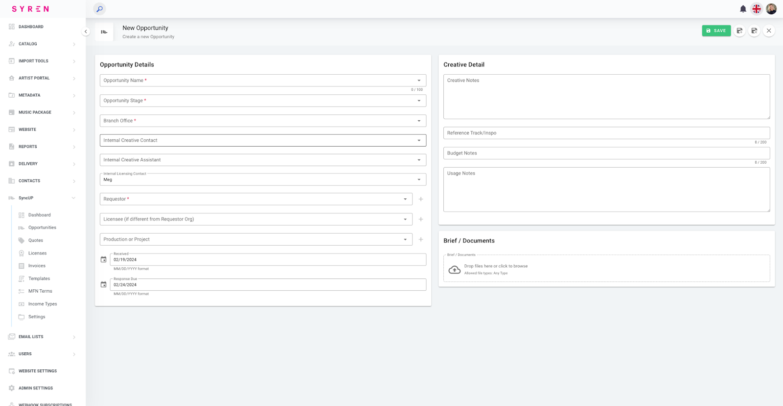 SyncUP (the new CRM module) is a sync licensing workflow tool that allows you to quickly create and manage your Sound Recording and Composition Quotes, Licenses and Invoices using automation and pre-defined templates.