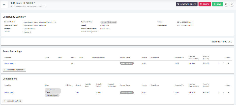 - The Edit Quote screen will appear with the Opportunity Summary details at the top. The first step is to add the Sound Recordings and/or Compositions.